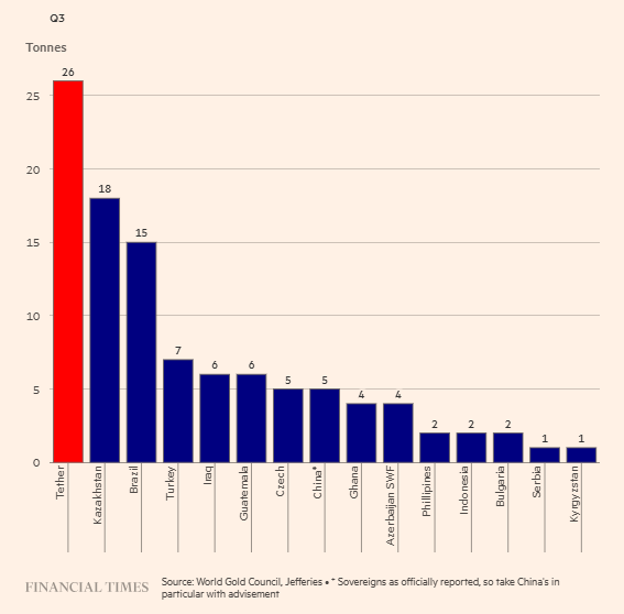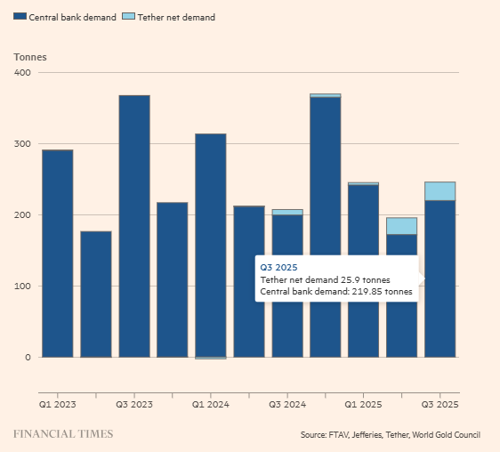 In Q3 2025 alone, Tether bought 26 tonnes of gold—nearly 12% of global central bank demand and about 2% of total gold demand. If Tether ploughs half its profits into bullion, that pace could double.