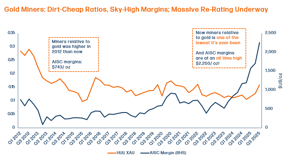 - The Margin Explosion: The Average All-In Sustaining Costs (AISC) for miners hover around $2,250/oz, making the math undeniable. With gold at $5,500, miners are pocketing a record spread of nearly $3,000 per ounce. A 1% rise in gold can now drive a 2–3% jump in miner valuations.