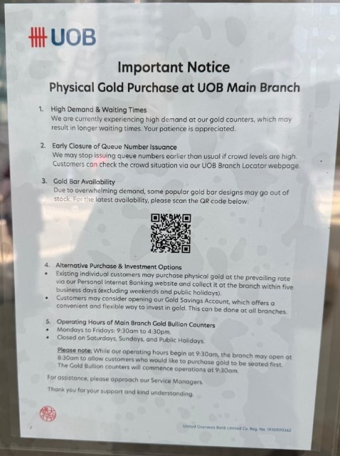 Even UOB’s Singapore branch had to post notices about long queues, early closure of issuance numbers, and bar designs running out of stock. It was gold fever — with air conditioning.