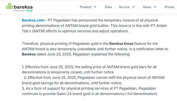 Back in June 2025, Pegadaian’s Galeri 24 (one of the biggest gold retailers in Indonesia) temporarily suspended all sales of ANTAM gold bars across all denominations. Supply constraints, operational issues, and unrelenting demand collided. And like in Japan, the smaller bars disappeared first.