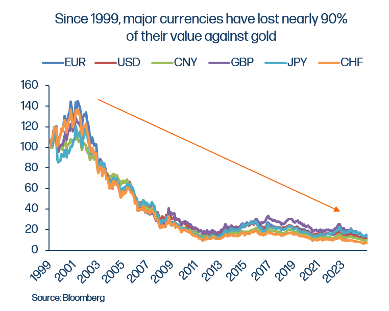 Since 1999, major currencies have lost nearly 90% of their value against gold. And as history shows, no global reserve currency lasts forever.