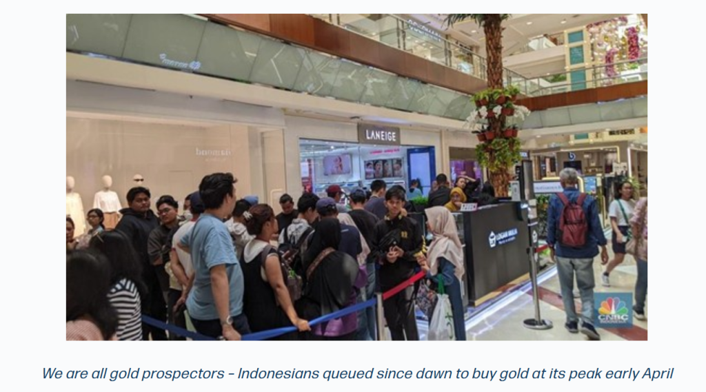 - This isn’t new. Back in May, during another gold frenzy, we published “We Are All Prospectors” and shared this photo of Indonesians lining up at dawn to buy gold in malls.