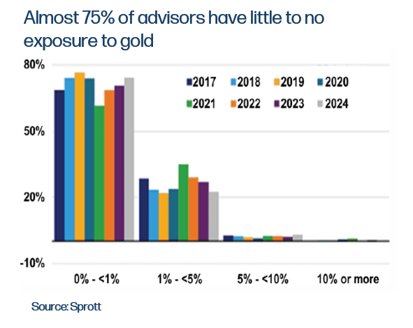 Almost 75% of financial advisors still allocate less than 1% to gold in client portfolios.