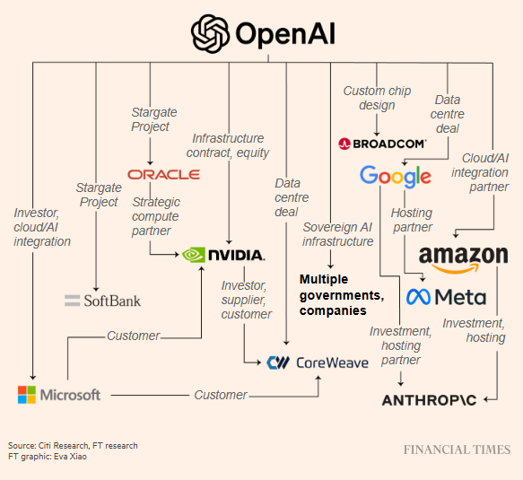 - CoreWeave gets Nvidia investment → sells compute to OpenAI → gives OpenAI equity