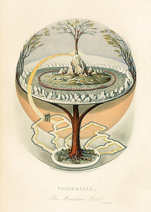 An illustration of Yggdrasil, the Norse World Tree that connects all realms, with Jörmungandr, the world serpent, encircling Midgard at its base.