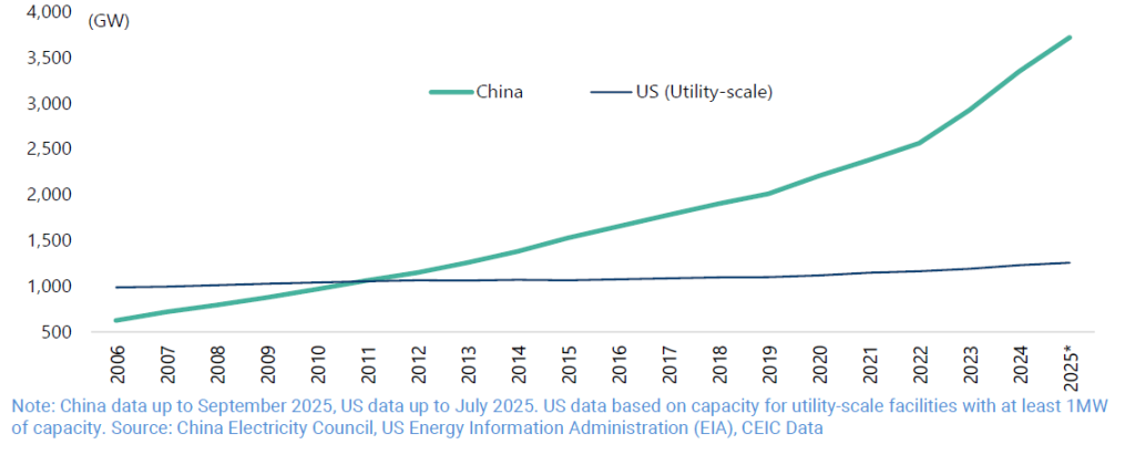 China and U.S. (utility scale) electricity generation capacity (stock). This is where the real power lies