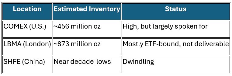 • Front-loading into U.S. vaults (COMEX hit ~456 million oz, triple historical norms)